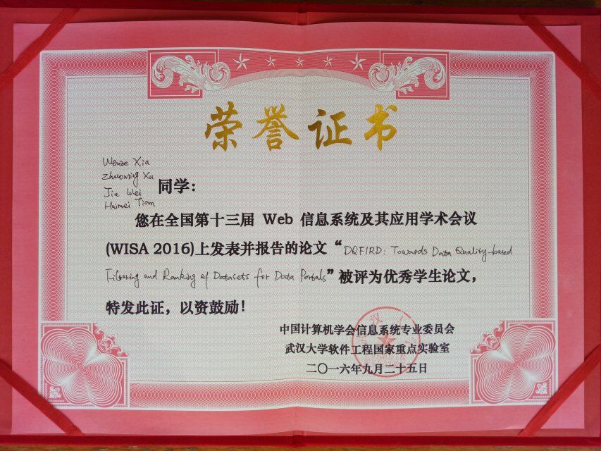由中国计算机学会(暨信息系统专业委员会)和IEEE Reliability Society共同主办、武汉大学承办、华中科技大学等单位协办的第十三届全国Web信息系统及其应用学术会议(13th Web Information System and Application Conference, WISA 2016)于2016年9月23-25日在湖北武汉成功举行。老王论坛 许卓明教授及其研究生参加了本届(WISA 2016)学术会议,并再次在WISA学术会议上荣获“优秀学生论文”奖。本次获奖论文是计算机科学与技术专业2014级硕士研究生夏文泽同学为第一作者的英文学术论文《DQFIRD: Towards Data Quality-based Filtering and Ranking of Datasets for Data Portals》。该论文由IEEE Press出版,将被EI检索。