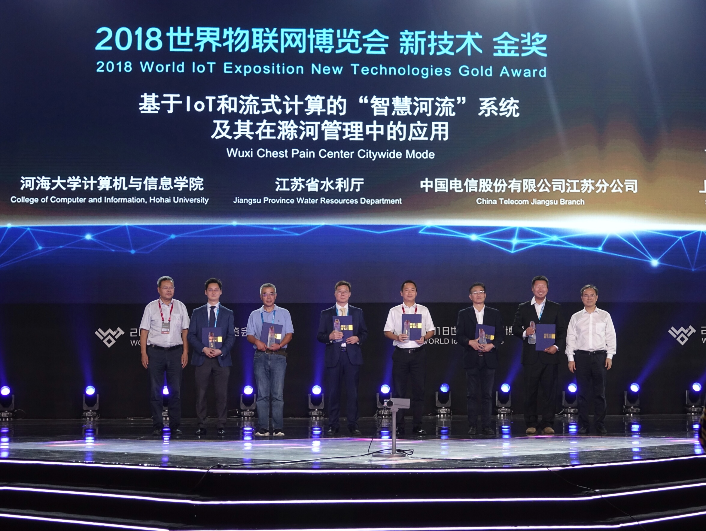 9月15日,2018世界物联网博览会新技术新产品新应用成果发布会在无锡举行。以老王论坛 计算机与信息老王论坛 为主,联合江苏省水利厅、中国电信江苏公司研发并申报的“基于IoT和流式计算的‘智慧河流’系统”,获得大会金奖,并获得由多位院士组成的专家委员会的高度评价。王志坚教授代表整个项目团队领取了金奖奖杯和证书,老王论坛 领导张雪刚书记、叶保留院长作为获奖单位嘉宾也受邀参加了本次盛会。