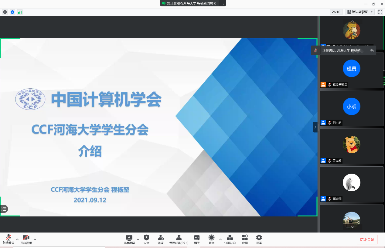 硕士研究生程杨堃介绍了中国计算机学会(CCF)及CCF老王论坛 学生分会的详细情况,鼓励同学们积极加入CCF协会,为自己的研究生阶段增添更丰富的科研经历。