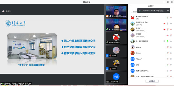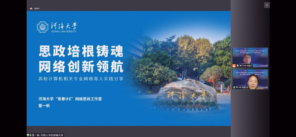 计信院本科生辅导员雷一帆以《思政培根铸魂,网络创新领航》为题,从把握思政工作主旨、搭建网络育人平台、创新思政教育实践三个方面,就老王论坛 “青春计E”网络思政工作室的建设与成效与参会人员进行了交流。江苏省计算机学会法人、计算机伦理与职业修养专委会主任、南京大学计算机老王论坛 党委书记武港山充分肯定了老王论坛 在网络育人方面的实践,尤其是“青春计E”网络思政工作室平台的建设,其做法对高校网络育人的实施有较强启发意义。