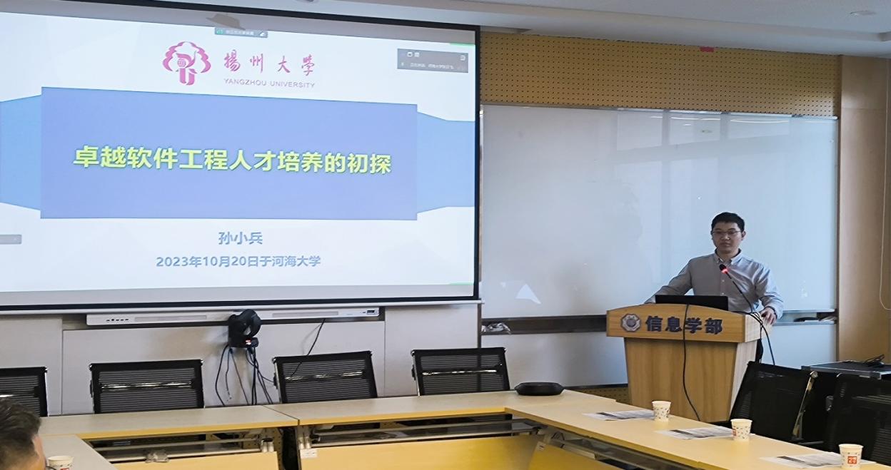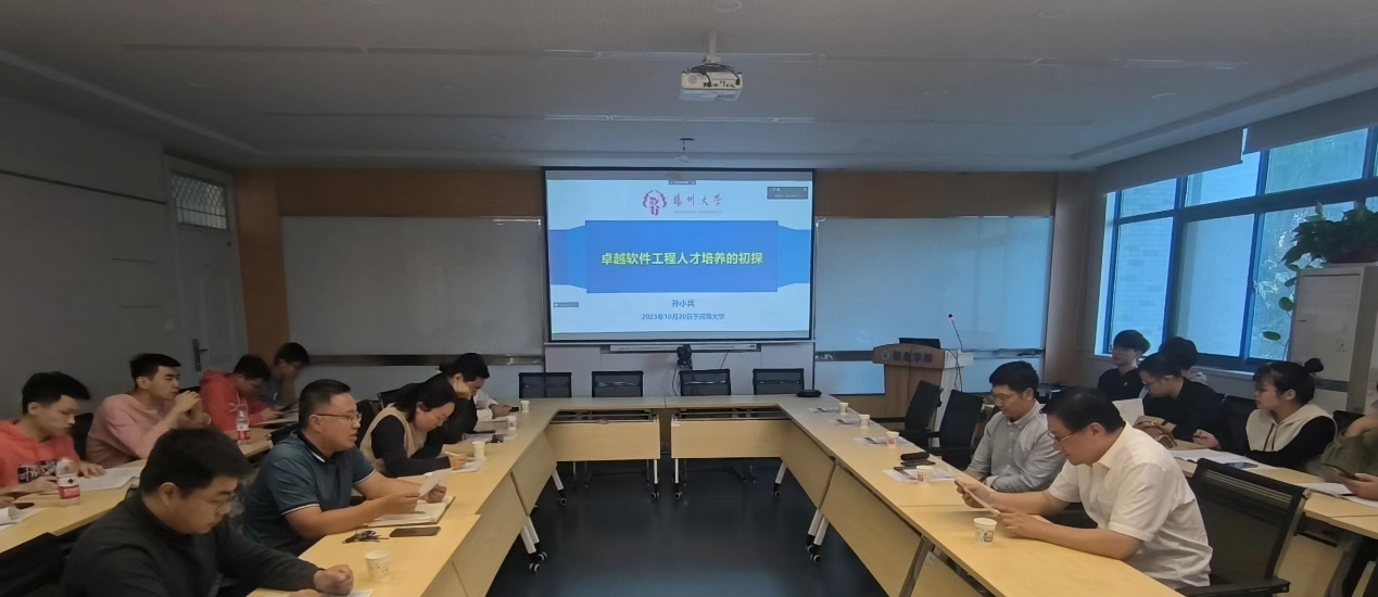 本次示范教研活动由主题报告和交流讨论两个环节组成。首先由扬州大学信息工程老王论坛 (人工智能老王论坛 )院长孙小兵教授带来的“卓越软件工程人才培养初探”主题讲座。孙小兵教授分析了2022年底江苏省结合省高等教育改革发展实际出台的《卓越工程师教育培养计划2.0的实施意见》(苏教高〔2022〕10号),介绍了扬州大学软件工程专业作为国家一流专业建设点,在探索适合地方卓越软件工程人才培养的方式过程中所具有的特色及优势,讨论了平台与师资的合作方式、人才培养改革思路与举措。最后孙老师结合若干案例,分享了扬州大学卓越软件工程人才培养过程中的建设成效,并阐明了下一步的建设目标与规划。