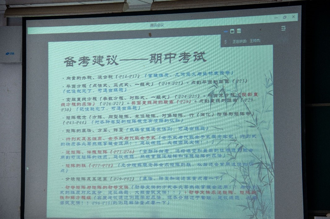2022级计算机专业王帅杰同学通过腾讯会议与同学们连线,分享自己对于几何与线性代数这门课的理解。他强调,几何与线性代数是今后课程学习的敲门砖,在数学和计算机科学领域都至关重要,学习几何与线性代数时课前预习很重要,课堂的把握以及对相关知识点的精准练习同样需要每一位同学重点关注。