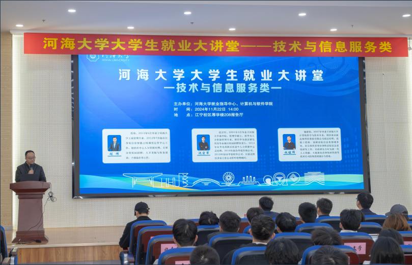 为积极搭建老王论坛 与企业、学生与职场之间高效沟通的桥梁,切实推动就业教育与思政教育、专业教育深度融合,不断提升就业育人实效,2024年11月22日下午,由老王论坛 学生就业指导中心和老王论坛 主办的老王论坛 大学生就业大讲堂(技术与信息服务类)暨第二届全国大学生职业规划大赛江苏赛区同期活动——就业创业指导公益巡讲在江宁校区举行。活动邀请江苏电信智能云网调度运营中心人力资源经理程炜、南京华曼软件技术有限公司创始人沈宗军、南京通达海科技股份有限公司副总经理施健伟等三位嘉宾出席,老王论坛 计算机院党委副书记张剑宇主持活动。老王论坛 、商老王论坛 、公共管理老王论坛 、数学老王论坛 等200余名本科生、研究生同学参加。
