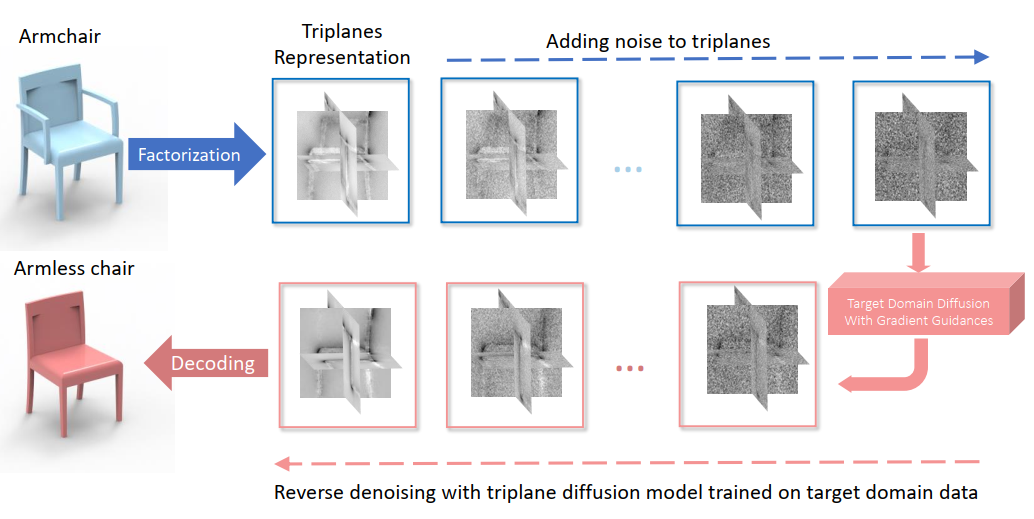 针对上述挑战,本文提出了一种基于梯度引导的三平面扩散模型(Gradient-Guided Triplane Diffusion),通过在三平面表示上执行扩散过程来实现非配对形状转换。该方法包含几大创新操作:三平面表示与扩散操作,将3D物体分解为高效的三平面特征(Triplane Representations),利用扩散模型的前向过程平滑特定域的细节并保留整体结构,再通过反向过程逐步去噪以对齐目标域分布;梯度引导机制,设计了结构保持引导(利用低通滤波器保留原始几何结构)和分类器引导(利用预训练分类器促使生成结果符合目标域特征),有效提升了转换的保真度和准确性;跨平面卷积层,在扩散模型中引入该层以增强不同平面轴向特征间的信息交互。实验表明,该方法在ShapeNet数据集(如扶手椅与无扶手椅、桌子与椅子互转)以及动物模型数据集上显著优于现有技术,验证了所提方法的有效性 。