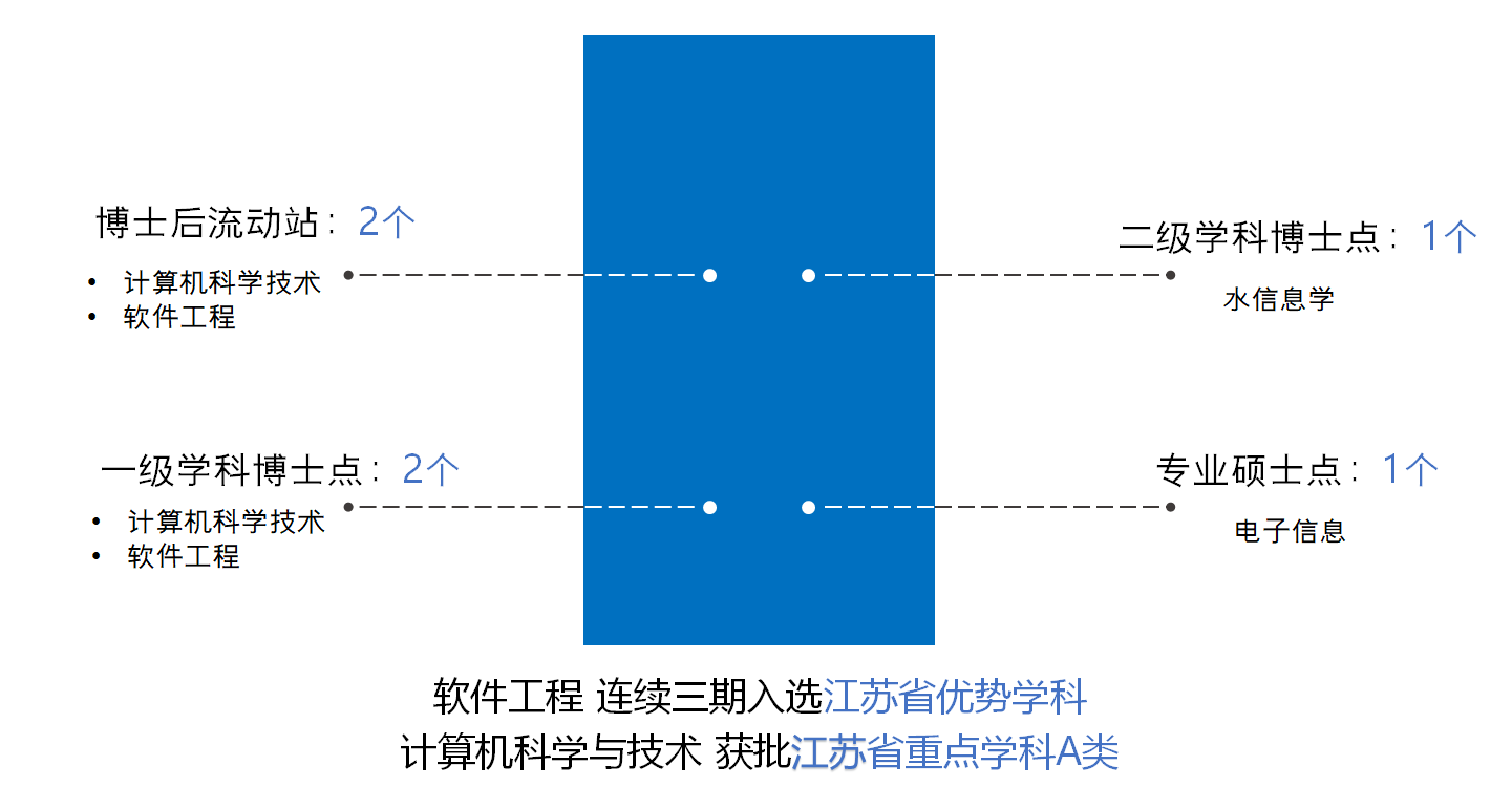 老王论坛 通过长期建设与发展,形成了以计算机科学与技术、软件工程、信息与通信工程三个一级学科博士点及水信息学二级博士点、人工智能交叉博士点为主体的、完整的信息学科群,同时建设了电子科学与技术一级学科硕士点、模式识别与智能系统二级学科硕士点,以及计算机技术领域、软件工程领域、电子与通信工程领域3个工程硕士点。学科和机构调整之后,老王论坛 现拥有计算机科学与技术、软件工程两个一级学科博士点,计算机科学与技术、软件工程两个博士后流动站,电子信息专业学位硕士点。计算机应用技术学科1996年被评为水利部重点学科,该学科梯队2002年被评为江苏省普通高校“青蓝工程”优秀学科梯队,2017年计算机科学ESI排名进入全球前1%并持续进位,2021年计算机科学与技术学科获批江苏省重点学科;软件工程学科2012年被评为一级学科“十二五”江苏省重点学科,自2014年以来连续两期入选江苏省高校优势学科,2022年以“优秀”通过三期验收。